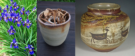 I continue to explore the possibilities of saggar firing, the process by which unglazed pots are wrapped in dried leaves and put in the kiln in individual boxes. The minerals in the leaves color the clay and create irregular, glaze-like patterns on the piece. I particularly like using the leaves from my Siberian irises mixed with a little sea weed.
