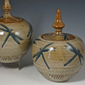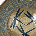 a layer of colored clay that is brushed on while the pot is still wet and soft. Patterns are carved through it to the clay underneath. A clear glaze covers the entire pot. This series is good on serving bowls, platters, small trays, mugs and I sometimes use it on bird feeders. Because of the deep texture, I do not recommend heavily curved slip designs for dinner plates.