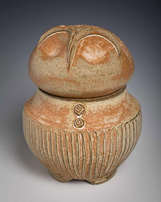 Owl jar: Inspired by African shrine figures, which are highly stylized human and animal figures with symbolic importance. Although it was not my original intention, many of mine have ended up looking somewhat like owls. Container with lid; matte glaze; 2008 |