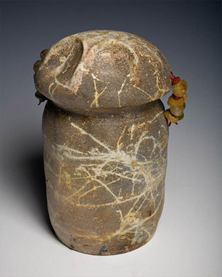 Saggar fired figure. The figure is fired in a box (called a saggar) packed with dried iris leaves and a little sea weed. The streaks are formed when the leaves are pressed lightly against the clay. The beads are handmade glass beads that I purchase in Ghana. |