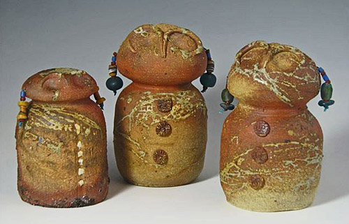 Saggar fired figures. Each figure is fired in a box (called a saggar) packed with dried iris leaves and a little sea weed. The streaks are formed when the leaves are pressed lightly against the clay. The beads are handmade glass beads that I purchase in Ghana. |