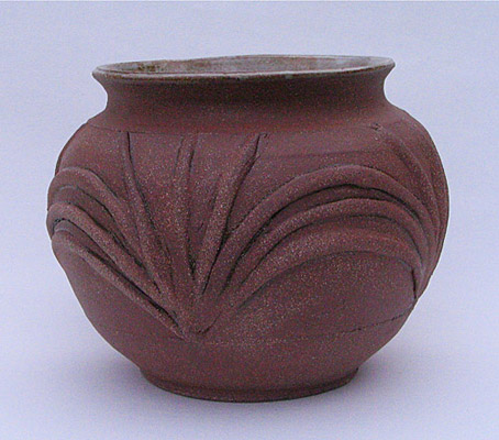 Jar with Fronds: Glazed on the inside; Unglazed on the outside with glazed highlights. Based on a design the potters were making in Sirigu, Ghana. 2007