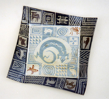 Square platter: A shallow platter,slip decorated with an assortment of Native American and African designs.
