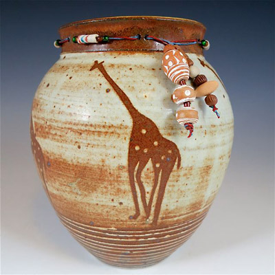 Bead Jar . The rabbit and giraffe are probably the oldest animal images I use. Both come from rock carvings in Southern Libya dating back about 7000 years. At that time the the region we now know as the Sahara was a lush, green savannah, much like the Serengeti is now. The beads are from Mali (clay), Ghana (glass), and Nicaragua (clay). I'm always buying beads when I travel. |